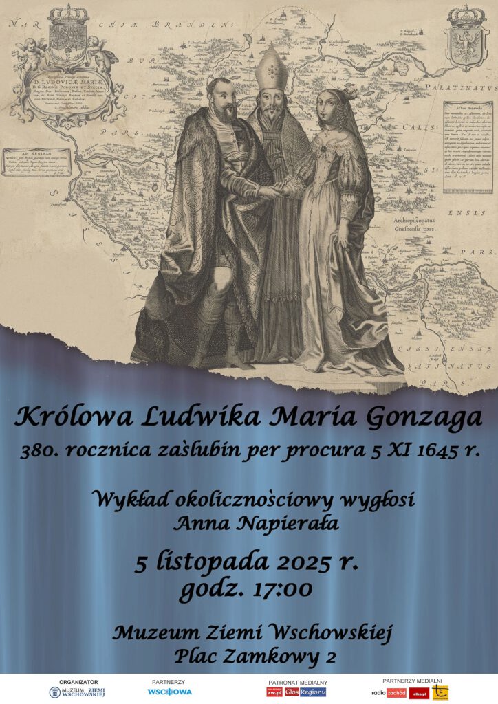 5 listopada br. o godz. 17.00 w siedzibie Muzeum Ziemi Wschowskiej na Placu Zamkowym 2 odbędzie się wykład otwarty, którego bohaterką będzie królowa Polski Ludwika Maria Gonzaga. Data wykładu nie jest przypadkowa gdyż w tym dniu, 1645 roku w pałacu wersalskim, doszło do zaślubin per procura Ludwiki Marii Gonzagi z Władysławem IV Wazą, którego reprezentował wojewoda poznański Krzysztof Opaliński.