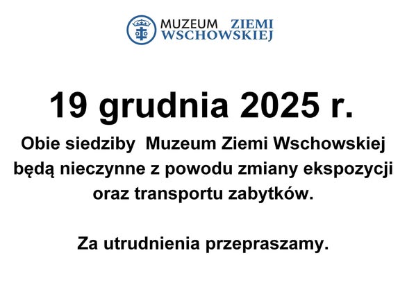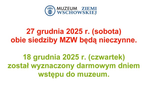 18 grudnia 2025 r. (czwartek) obowiązuje darmowy dzień wstępu do muzeum. 19 grudnia oraz 27 grudnia 2025 r. obie siedziby muzeum będą nieczynne. Za utrudnienia przepraszamy.